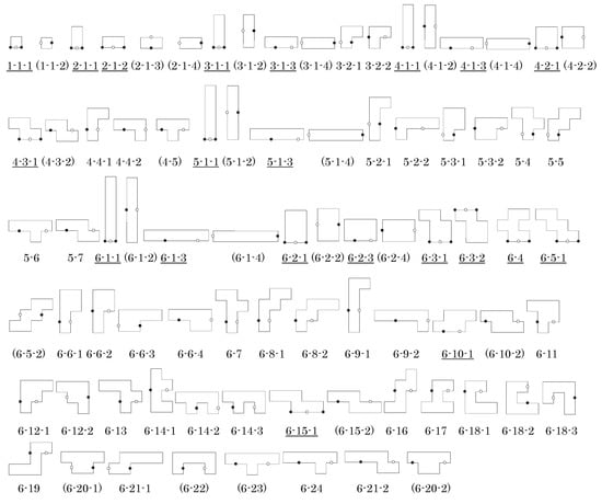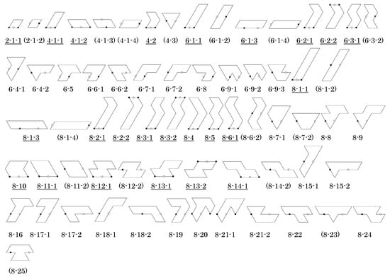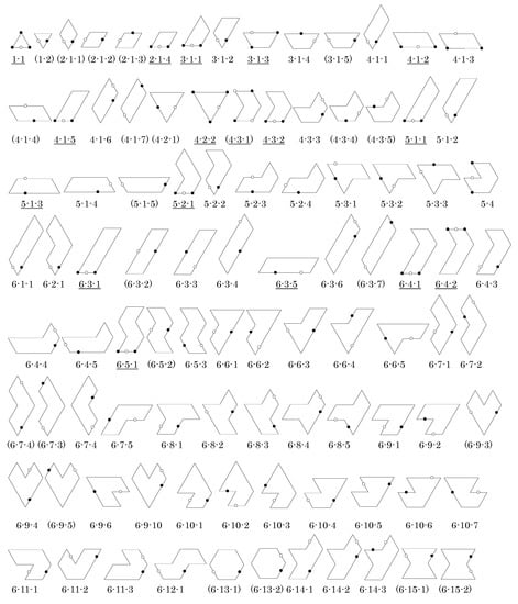 For example, for a pgg symmetry group having 4-iamonds as fundamental domains, there are 14 tiles in Figure 27 whose label begins with 4, so . But 6 of the corresponding tilings in Figure 28 have additional symmetry (namely 4-1-4, 4-1-7, 4-2-1, 4-3-1, 4-3-4, and 4-3-5) indicated by parentheses around their labels, so . Also in Figure 27 we can see that among the 4-iamonds tiles, there are only 3 distinct shapes, indicated by the tile numbers: a parallelogram (tiles 4-1), an equilateral triangle (tile 4-2), and a chevron (tiles 4-3). Thus . Similarly, among the eight 4-iamonds counted by (tiles 4-1-1, 4-1-2, 4-1-3, 4-1-5, 4-1-6, 4-2-2, 4-3-2, and 4-3-3), there are also these three distinct shapes, so .