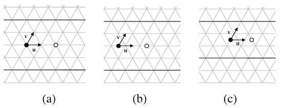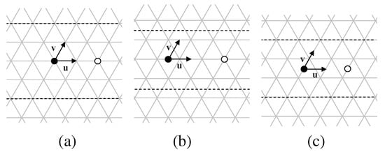 To begin, we place a black circle as a 2-fold center on a lattice of unit triangles and call this the origin, then place vectors and at the origin along (or parallel to) edges of unit triangles, as shown in Figure 26. Next we place two horizontal glide-reflection axes nearest to the origin. These go through the points , where y is a positive integer. Finally we place a white 2-fold center at a point , where x is a positive integer. This white center will be a nearest 2-fold center that is inequivalent to the black 2-fold center. The placement of this 2-fold center determines the length of the minimal glide vector for the glide-reflection axes placed.