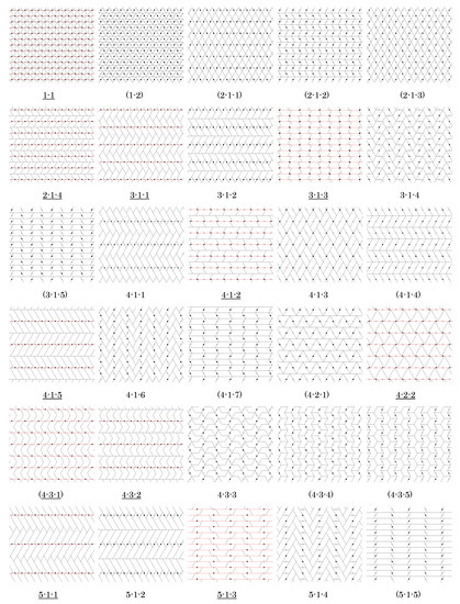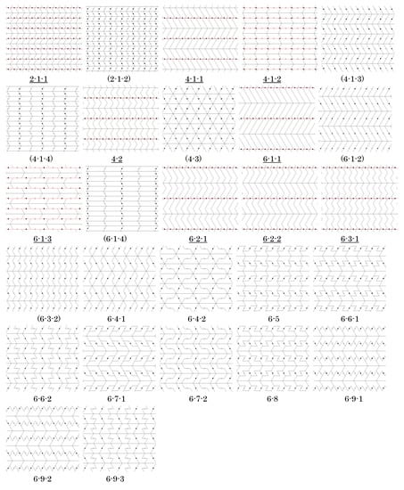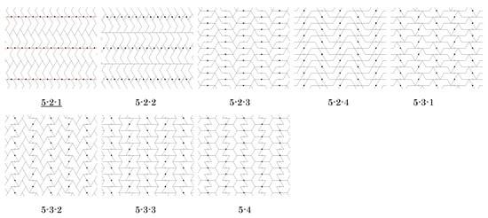 Our procedure described in the previous section produces polyiamond tiles T that are fundamental domains for a given pgg group G that generates an isohedral tiling . However, it is possible that G is a proper subgroup of the full symmetry group of and T is not a fundamental domain for (Theorem 1). The pgg group G can be a proper subgroup of a symmetry group of any of these types: pgg, cmm, pmg, or p6m. In Section 5.3, we described additional symmetries possible for the full symmetry group for both polyomino and polyiamond tiles having symmetry. Tilings 2-1-2, 4-1-4, and 4-1-7 in Figure 28 have tiles with symmetry and have pmg symmetry group. In particular, all tilings by polyiamond parallelogram tiles that fill out parallel strips bounded by adjacent glide-reflection axes will have pmg symmetry group. Tilings 3-1-5, 4-2-1, and 4-3-5 in Figure 28 have tiles with symmetry and have pmg symmetry group. Tiling 2-1-1 in Figure 28 has a tile with symmetry and has cmm symmetry group.
