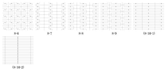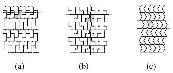 A rotation of a polyomino tile T in about the black 2-fold center on T fills out the rectangle bounded by the reflection axes placed at the outset, and repeated reflections of this rectangle in those axes produce an isohedral tiling having T as a fundamental domain for the cmm group G. Figure 32 shows the set of tilings generated in this manner, corresponding to the tiles in Figure 31 for . More details on these tilings and their symmetries are in the next section.