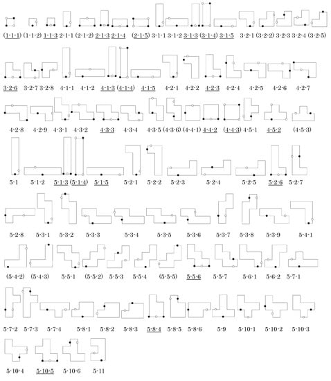 - Golomb, S.W. Polyominoes: Puzzles, Patterns, Problems, and Packings, 2nd ed.; Princeton University Press: Princeton, NJ, USA, 1994. [Google Scholar]