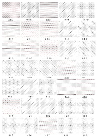 For brick tiles T, if the inequivalent 2-fold centers on T are located on one edge of T or on opposite edges of T so that a line through them is perpendicular to those edges, we will not distinguish between type 1 and type 2 tilings, since the type 1 case occurs as a special case of a type 2 tiling. The tilings generated by G for these brick tiles will always have slide lines, and depending on the rectangular shape and the position of the 2-fold centers and glide-reflection axes, the pmg, pmm, and cmm tilings in Figure 7 can be generated by G, as well as p4m tilings. Brick tilings unique to this pgg group G are those of “herringbone” type in which the 2-fold centers on a brick tile are on adjacent edges (e.g., tiles and tilings 2-1-1, 3-1-1 in Figure 22 and Figure 23); a square brick of this type generates a p4m tiling (e.g., tiles and tilings 1-1-2 and 4-4-1 in Figure 22 and Figure 23). Other brick tilings have the inequivalent 2-fold centers on a brick tile on opposite edges, where a line through them makes a angle with those edges (e.g., tiling 2-1-2 which has p4g symmetry, and 4-1-2 in Figure 23).