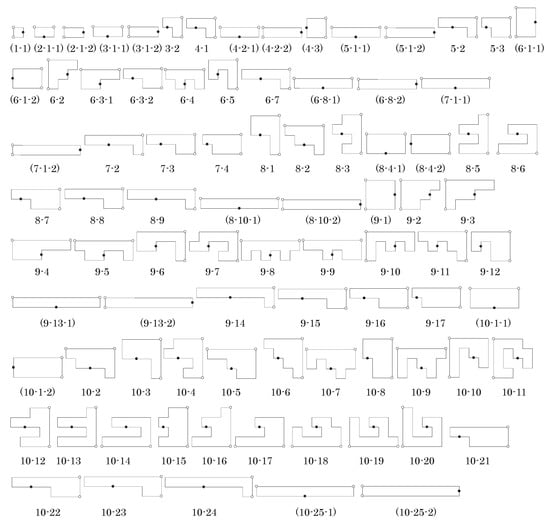 As before, actions of G on the unit squares partitions the unit squares into n equivalence classes; the equivalence class of a unit square e is denoted . For each integer , we construct an n-omino tile that is a fundamental domain for the group G by the procedure described in Section 4.2, with reference to Figure 30. Here the unit squares must be taken from the region enclosed by the reflection axes shown in Figure 30. Figure 31 shows the complete set of n-omino tiles constructed by this procedure for .