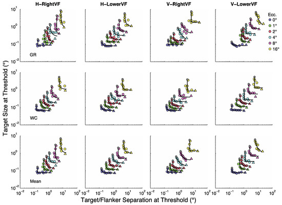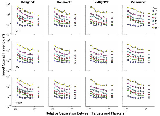 Figure 2 summarizes the results for the two participants (rows 1 and 2) as well as their averaged results (row 3). In each panel the y-axis represents target size (in degrees visual angle) at threshold and the X-axis represents target/flanker separation in multiples of target size (relative separations). Each line (color) represents a given eccentricity as shown in the legend. The four panels in each row show results for the horizontal (H) and vertical (V) flankers when presented in the RightVF or LowerVF. Figure 3 replots the same data with the x-axis as actual separation (in degrees visual angle). Actual separation is obtained by multiplying target size at threshold by the relative separation. The colored circles represent conditions in which the relative separations were 1.25 to 8× target size. Triangles represent the unflanked condition (plotted at 16 times target size in Figure 2 and Figure 3).