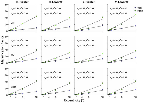 In each panel of Figure 4 the blue and green data points have been fit with a function of the form . The values of and and the proportion of variability () in the data explained by the lines are shown within each panel. In general the fits are quite good, explaining, on average, about 97% of the eccentricity-dependent variability in both and μE/μ0. The y-axis in Figure 4 is labeled “Magnification Factor” because the curves represent the degree to which the functions shift up and to the right with eccentricity.