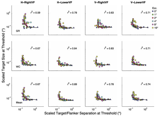Scaled target size at threshold vs. scaled target/flanker separation at threshold. (See text for details.) The four columns represent the four combinations of flanker positions with respect to the target (H and V) and position in the visual field (RightVF and LowerVF). Symbol colors represent eccentricities of 0 to 16°. Circles represent target/flanker separations of 1.25 to 8 times target size at each eccentricity. Triangles represent the unflanked condition at each eccentricity; these are depicted at 16 times target size.