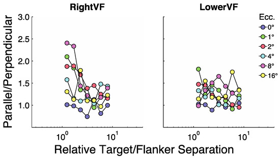Effect target/flanker configuration in the RightVF and LowerVF. The ratio of size threshold for parallel flankers to perpendicular flankers is shown as a function of relative separation for the RightVF and LowerVF. The ratios have been formed from the average data (row three) from Figure 2.