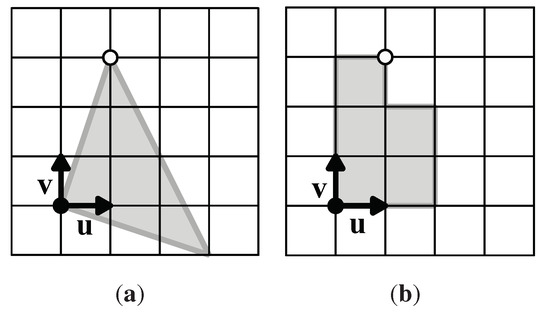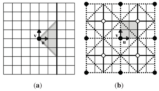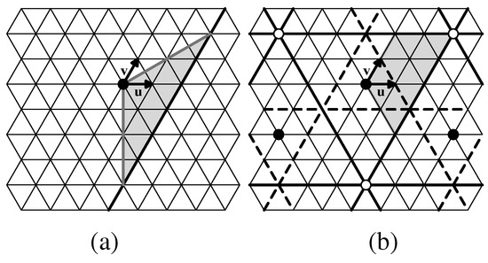 So first we place a 6-fold rotation center, a black circle, at a lattice point and call this the origin, then place vectors and at the origin, along edges of a unit triangle. Next we place a 3-fold rotation center, a white circle, at , where x and y are nonnegative integers, not both 0. See Figure 16(a). These choices of 6-fold and 3-fold rotation centers determine the whole p6 lattice of rotation centers; rotations about the two chosen black and white centers generate G.