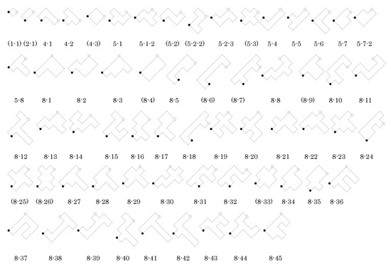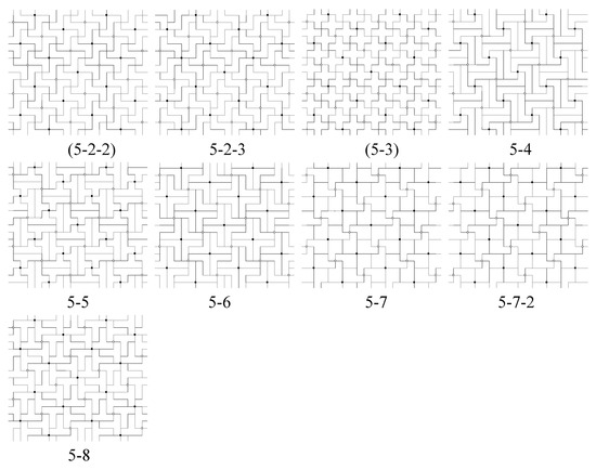 - Look at all vertices and centers of unit squares in a polyomino in except for the original 4-fold centers we have chosen (black and white centers), and determine whether or not is invariant under a 4-fold rotation about such a point. If so, then it is a new 4-fold center for , and this symmetry is not in G. For example, in Figure 3, tilings (5-2) and (5-2-2), while generated differently, are the same tiling and have 4-fold centers at every vertex where 4 tiles meet. Tiling (5-3) has 4-fold rotation centers at the centers of the “cross” tiles and at every vertex where 4 tiles meet. These tilings have full symmetry groups of type p4, with G as a proper subgroup.