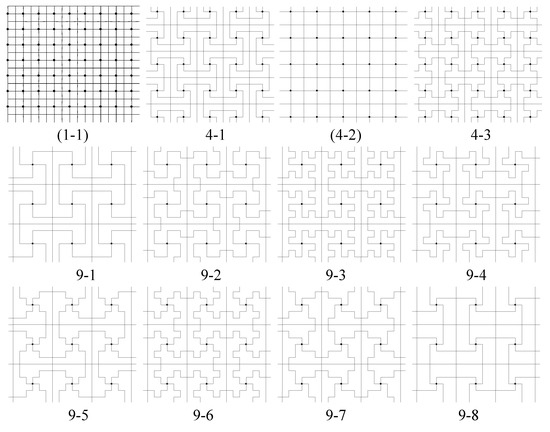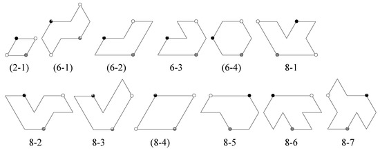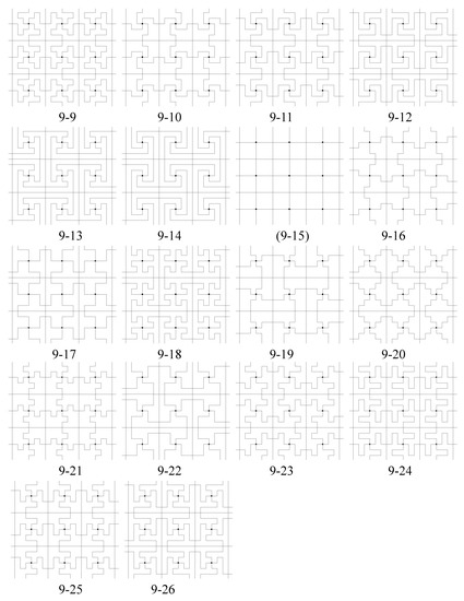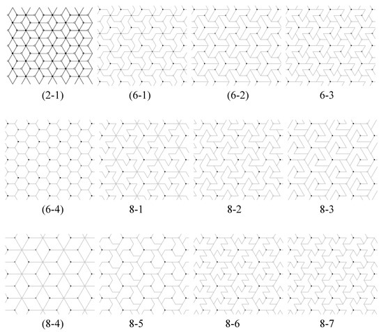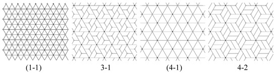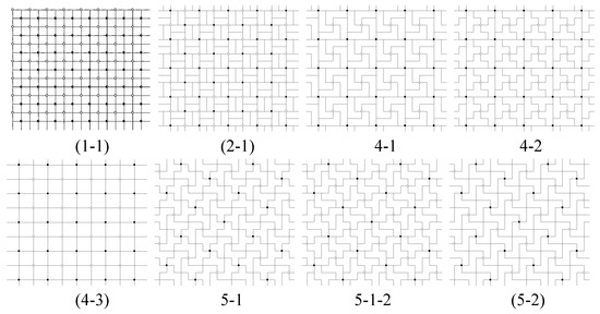 - Other new symmetry elements of can be sought by using Chart 2 in [6]. If the line joining the black and white 4-fold centers we placed is an axis of mirror reflection for , then is type p4m. For example, in Figure 3, tilings (1-1) and (4-3) are type p4m. If this line is not a mirror reflection axis, but the line connecting two adjacent (nearest) 2-fold centers for is a mirror reflection axis for , then is type p4g. For example, in Figure 3, tiling (2-1) is type p4g.