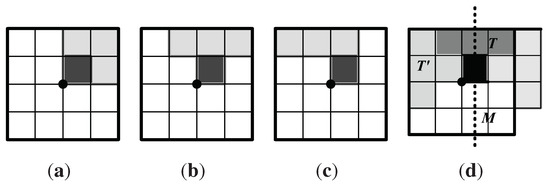 Let be the full symmetry group of a tiling produced by a p4g group G acting on a polyomino T that is a fundamental domain for G, constructed as described in Section 3.1. If G is a proper subgroup of , then by Theorem 2, there is a 2-fold or 4-fold rotation or reflection symmetry g in that is also a symmetry of T. By its construction, one corner of T is a 4-fold center for G at the origin; without loss of generality, we may assume that T contains the unit square shown in black in Figure 7.