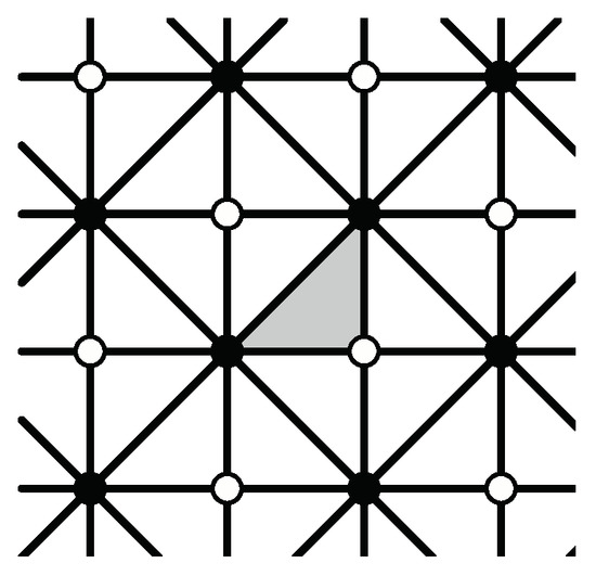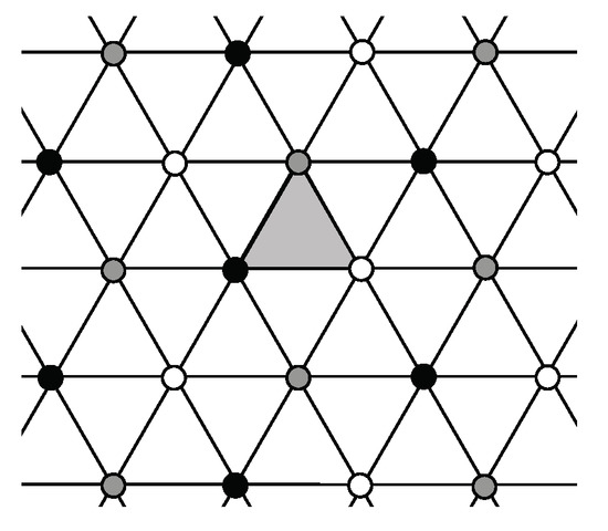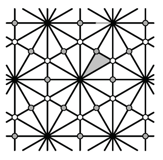 - Look at all vertices and centers of unit triangles in T except for those centers of rotation in G (black, white and gray centers), and determine whether or not any can be new 3-fold centers for . If a new 3-fold center is found, then the full symmetry group of contains G as a proper subgroup and T is not a fundamental domain for . If a new 3-fold center is a 6-fold center, is type p6m if there is a reflection axis joining it to any nearest 3-fold center; otherwise, is type p6. Tiling (6-4) in Figure 11 is type p6m, and has a 6-fold center at the center of the hexagonal 6-iamond. If there are new 3-fold centers but none are 6-fold centers, then is type p3.