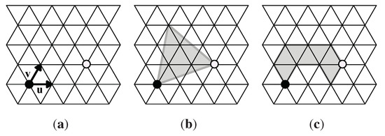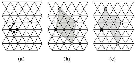 (a) A lattice of unit triangles with a black 6-fold rotation center and white 3-fold rotation center that generate a p6 group G; (b) A triangular fundamental domain (shaded) for G; (c) A polyiamond fundamental domain (shaded) for G. Here , ; the area of each fundamental domain is 7 triangular units.