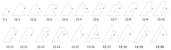 For example, for symmetry group p6 and , there are 20 tiles in Figure 17, with corresponding isohedral tilings in Figure 18, so . Since tiling 7-1 of Figure 18 has parentheses around its label, . From Figure 17, we can see that four pairs of tiles are congruent: 7-1 and 7-1-2; 7-3 and 7-3-2; 7-5 and 7-5-2; 7-12 and 7-12-2. Thus . Among the 19 tiles counted for , there are also 16 non-congruent tiles, so .