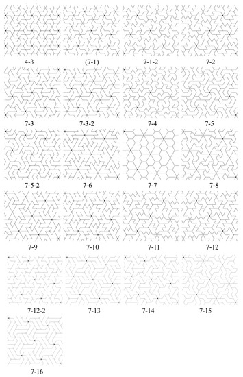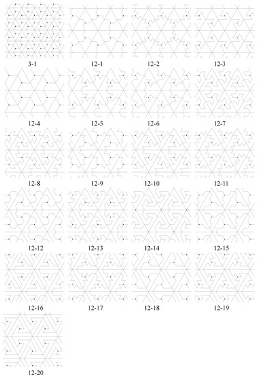 - Otherwise, look at all vertices and centers of unit triangles in a polyiamond in except for those black and white rotation centers in the p6 group we have generated and determine whether or not they can be new 3-fold centers for . If new 3-fold centers are found, the full symmetry group of the tiling contains G as a proper subgroup. Tiling (7-1) in Figure 18 has a larger p6 symmetry group than G since there are 3-fold rotation centers for at the centers of the rotor-like polyiamond tiles. Note that the same tiles appear in tiling 7-1-2, but in this tiling, the centers of the tiles are not 3-fold centers of rotation for .