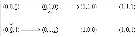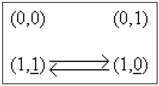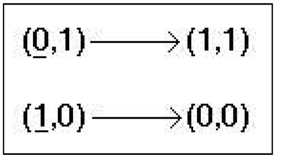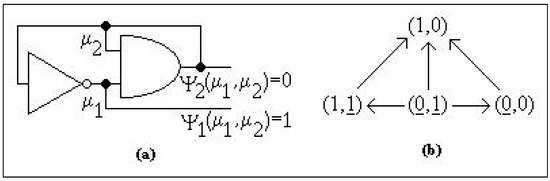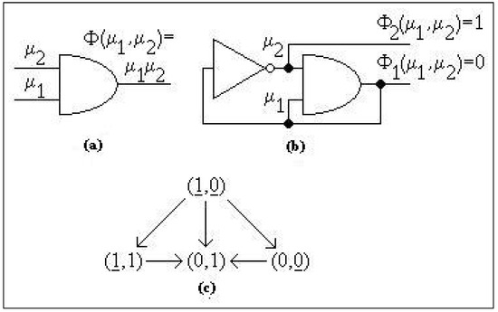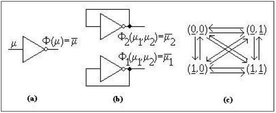 etc. In Figure 1, we have drawn at (a) the logical gate NOT, i.e., the circuit that computes the logical complement and at (b) a circuit that makes use of logical gates NOT. The asynchronous system that models the circuit from (b) has the state portrait drawn at (c). In the state portraits, the arrows show the increase of (the discrete or continuous) time. The underlined coordinates are these coordinates for which and they are called excited, or enabled, or unstable. The coordinates that are not underlined fulfill by definition and they are called not excited, or not enabled, or stable. The existence of two underlined coordinates in shows that may be computed first, may be computed first, or , may be computed simultaneously, thus when the system is in , it may run in three different directions, which results in non-determinism.