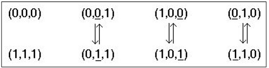 The system from Figure 5 is symmetrical and a group of symmetry is generated by the couples see Equation (10); are transpositions that permute the isolated fixed points