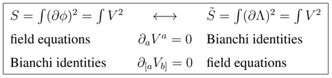 Hence, we see that the field equations for the original model, (14), takes the same form as the Bianchi identities for the dual model, (19), and that the Bianchi identities for the original model (15) are dual to the field equations for the dual model, (18). To summarize, the dual models are related by