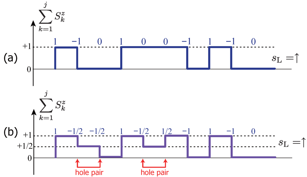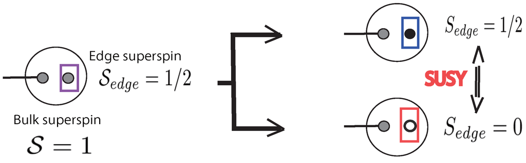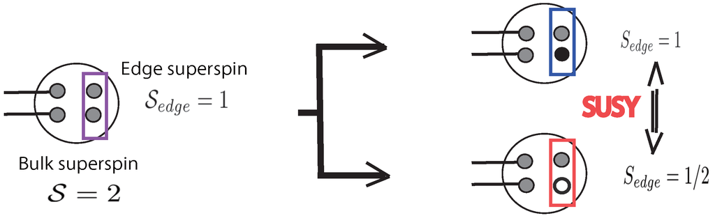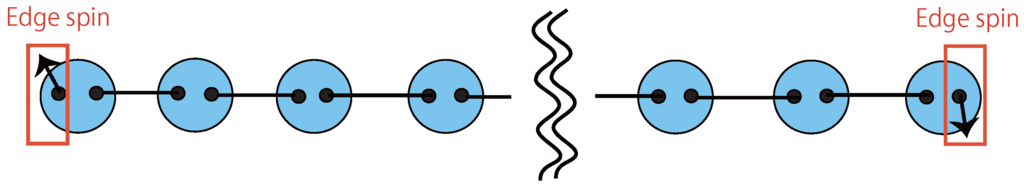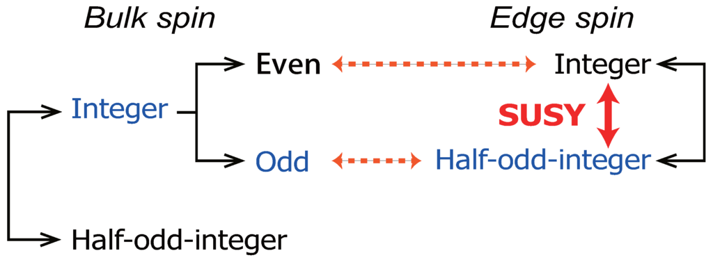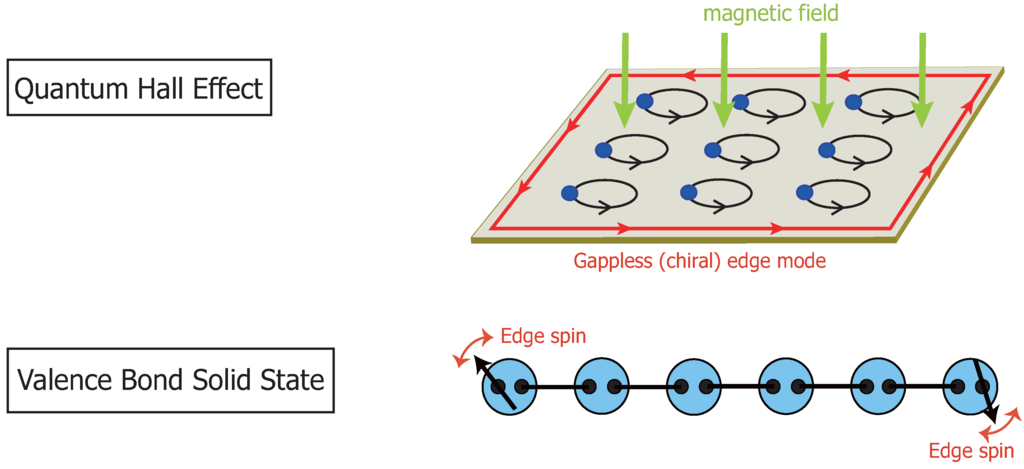 As with other quantum-disordered paramagnets, the VBS states have a finite excitation gap and exponentially decaying spin correlations. However, the VBS states are not “mere” disordered non-magnetic spin states; the spin-S VBS states necessarily have gapless modes at their edges or, more specifically, emergent spin- edge spins [13,14]. This might remind the readers of the (chiral) gapless modes at the edge of the QHE systems, where excitations are gapful in the bulk (see Figure 1). Similar features are found in topological insulators, as well, [15,16,17] and considered as a hallmark of the topological state of matter. Furthermore, in 1D, the VBS states are known to exhibit a non-local order, called the hidden string order [18,19]. What is prominent in the VBS states is that they most typically exhibit a certain kind of topological order even in 1D, while QHE needs at least 2 D to work. This is a great advantage for the investigation of the VBS states, since in 1D, most calculations of physical quantities can be carried out exactly by using the matrix product state (MPS) representation [20,21,22,23,24,25] combined with the transfer-matrix method.