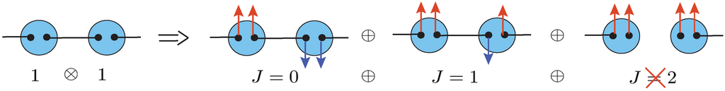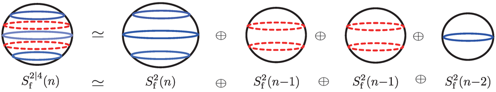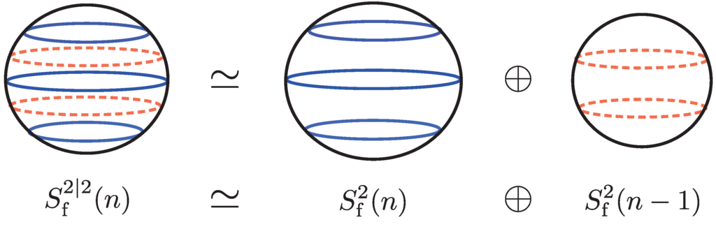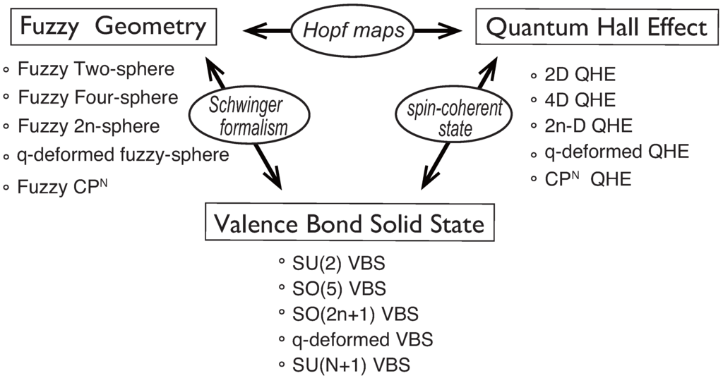 On the other hand, we have already seen that the Bloch spin-coherent state enables us to relate the Laughlin-Haldane wave functions to the VBS states. In correspondence with such QHE, a variety of VBS models have been constructed with the symmetries, such as , [112,113,114], [115,116,117,118], [119,120] and q-deformed [22,23,121,122,123] [see Figure 2]. The VBS states demonstrate manifest relevance to fuzzy geometry also, by adopting the Schwinger operator formalism (see Section 2.1).