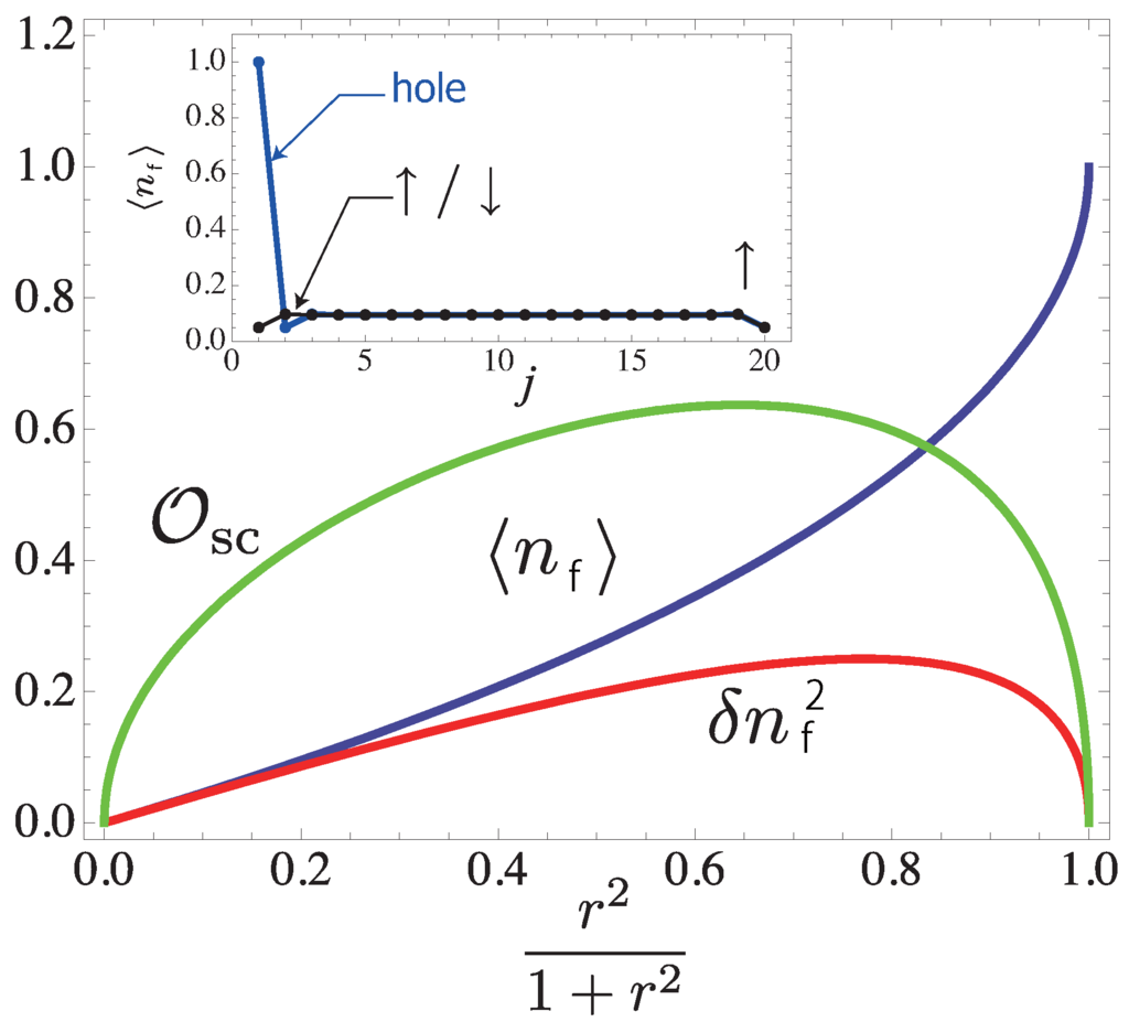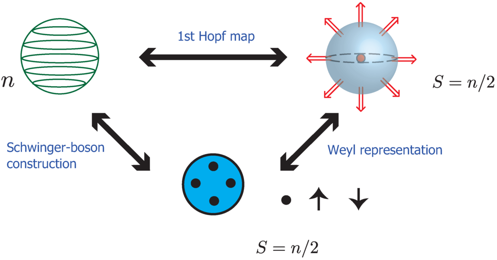Physically, this bosonic construction realizes the ferromagnetic (Hund) coupling among n spin-1/2s to yield the maximal spin, , at each site. We have already seen that the spin wave function, written in terms of the Hopf spinor , coincides with those of the non-interacting electrons moving on a two-sphere in the presence of the monopole magnetic field.