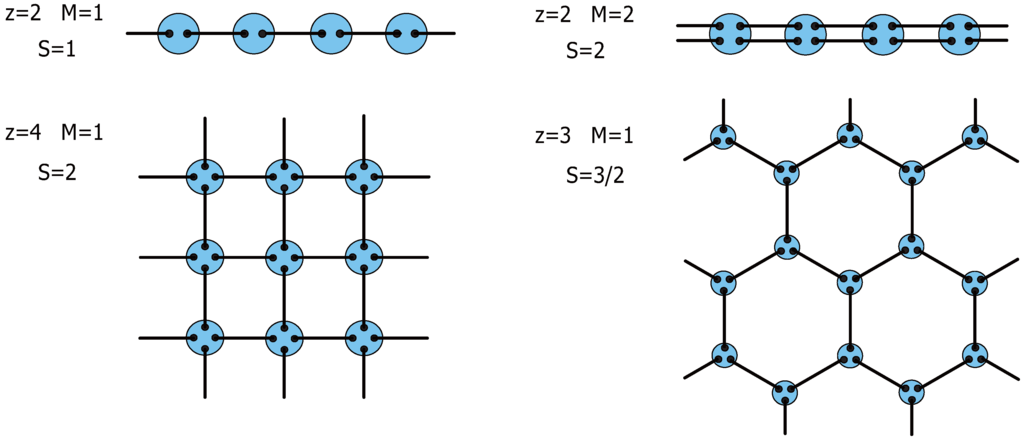 Now, we demonstrate that a similar analogy exists even when we switch on strong interactions. Specifically, the exact ground-state wave functions of a class of interacting spin models, called the valence-bond solid (VBS) model [6,7,75], closely resemble the Laughlin wave functions on a two-sphere. The ground states of the VBS models (dubbed the VBS states) on a lattice with coordination number, z (see Figure 4), are constructed as follows. As the first step of the construction, we prepare n () local spins (auxiliary spins) on each vertex (site) of the lattice. Next, we connect every pair of two spin-1/2s on the nearest neighbor sites by spin-singlet bonds (since the spin-singlet state of the two spin-1/2s maximizes the entanglement entropy, the pair is sometimes called maximally entangled in modern literature.) called the valence bonds (VB) (see Figure 4). Last, we project the entire -dimensional Hilbert space of n spin-1/2s onto the subspace with the desired value of the (physical) spin S () on each site to obtain the spin-S many-body singlet state. Depending on which irreducible representation we use to realize the physical spin, we obtain different states even for the same lattice structure (some examples may be found in, e.g., Reference [114]). This kind of construction (valene-bond construction) applies to any lattice in any dimensions (see Figure 4 for typical examples in 1D and 2D), and the state obtained thereby is called the VBS state or, in modern terminology, the projected entangled-pair state (PEPS) [164,165].