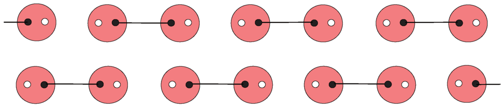 Since the VBS Hamiltonian is defined as the projection operator for the Hilbert space of a pair of neighboring spins (see Section 4.3 for detail), the state of the form (29) is the ground state regardless of the edge polynomials. Therefore, there appear degenerate ground states for the spin-S() VBS state on a finite open chain (see Figure 5) [7]. From similar considerations, it is obvious that the higher-dimensional VBS ground states (e.g., those in Figure 4) have degeneracy exponentially large in the size of the boundary. In the following, unless otherwise stated, we implicitly assume that the VBS state is defined in 1D and will focus on the spin-1 case.