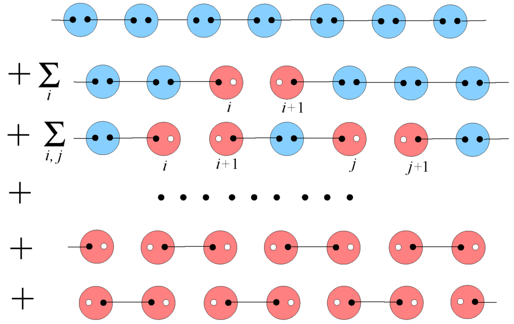where implies that the product is taken over all nearest-neighbor bonds, , and denotes the vacuum of the Schwinger bosons. From (), it is obvious that the state Equation (29) is spin-singlet. As z bonds emanate from each site of the lattice (for instance, is for 1D chain and for D-dimensional hypercubic lattice), we have Schwinger bosons per site in the VBS state (29):
