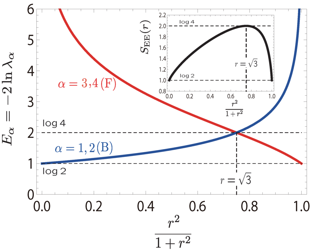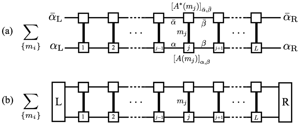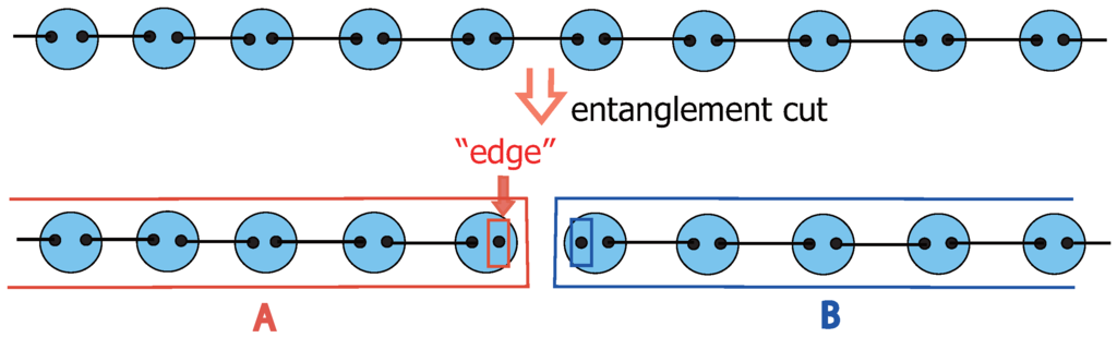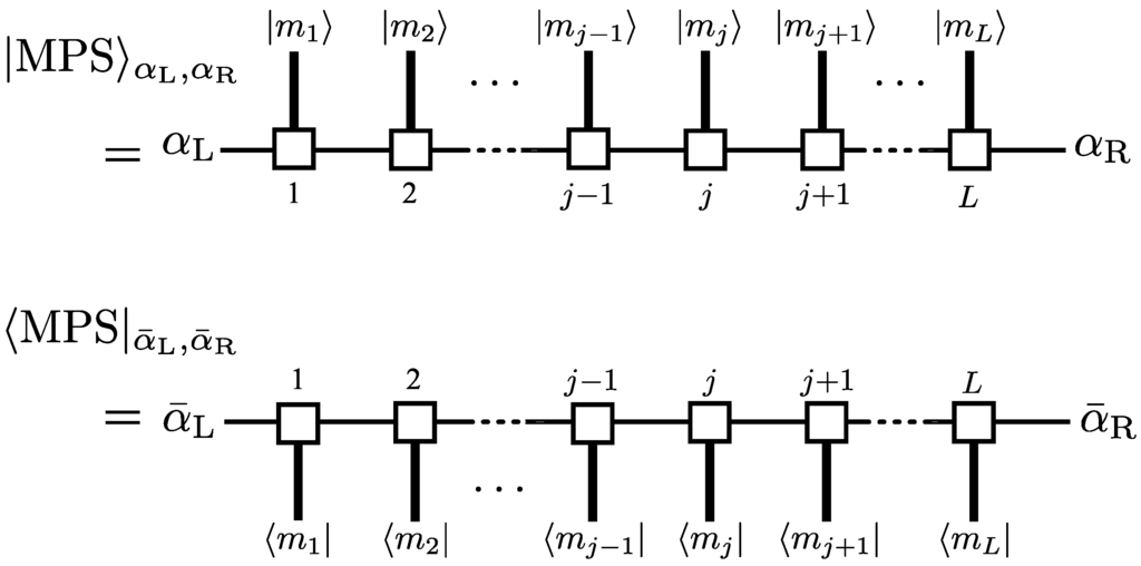 Since the topological character of a system is believed to be encoded in the many-body ground-state wave functions rather than in its Hamiltonian one, the relatively simple structure of the VBS wave function is suitable to investigate its topological properties by using such modern means as entanglement entropy [26,27] or the entanglement spectrum [28]. For the above reasons, the VBS states or, more generally, the MPS as a class of model states that satisfy the so-called area-law constraint [29] have attracted renewed attention as a “theoretical laboratory” in the recent study of topological states of matter. In fact, the MPS representation is now regarded as a natural and efficient way to describe quantum entangled many-body states and for a given (1D) Hamiltonian, the density matrix renormalization group (DMRG) [30] provides a powerful tool to find the optimized variational wave function in the form of MPS (see [31,32,33] for more details about the MPS method and DMRG). The key idea here is that for generic short-range interacting systems, only a small part of the entire Hilbert space is important, and depending on the problems in question, there are variety of ways to parametrize this physically relevant subspace. Although the Wigner’s -symbol may give a convenient description of -invariant MPS states [34,35,36], we adopt in the present paper the Schwinger-particle formalism (see, for instance, chapters 7 and 19 of [37]) to emphasize the analogies to the lowest Landau level physics. The list of possible applications includes a convenient description of gapped quantum ground states [29,38,39], as well as its application to efficient simulations of dynamics [40,41,42,43,44,45] and variational calculations [46,47,48,49]. Due to their simple structure, the entanglement entropy of the VBS states comes only from the bond(s) cut by the entanglement bipartition [50,51,52,53].