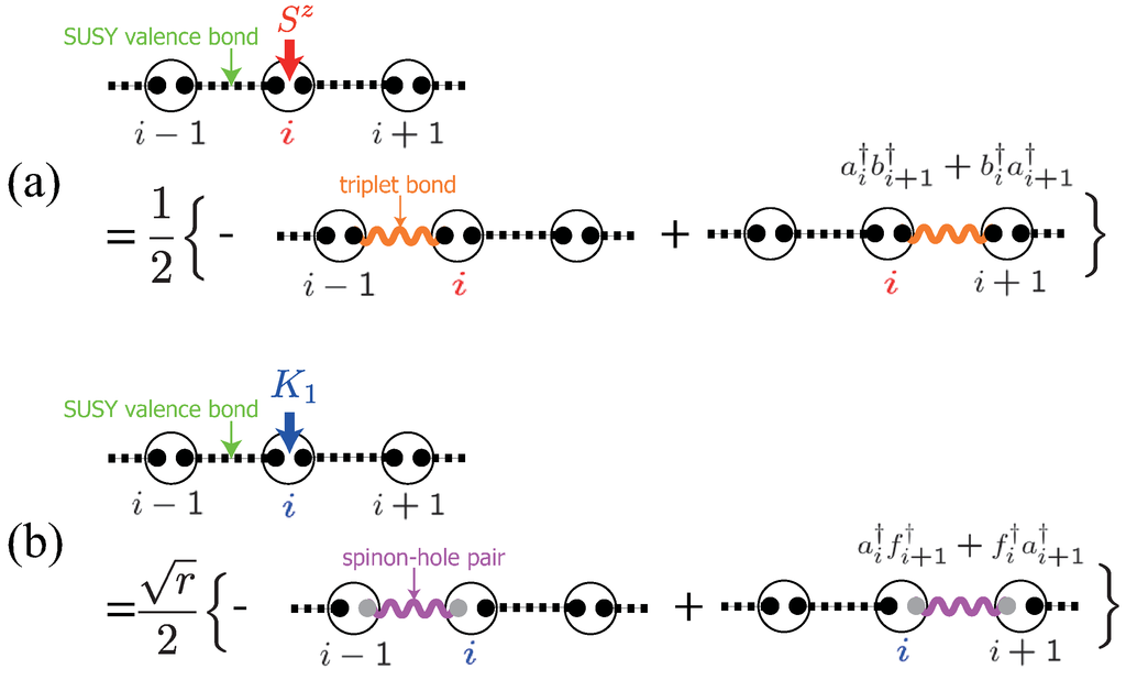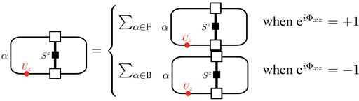 Now, let us come back to the SU(2) VBS states. If we represent the up and down degrees of freedom of auxiliary spin-1/2 by the Schwinger bosons, and (see Equation (25)), the singlet valence bond on the bond reads: