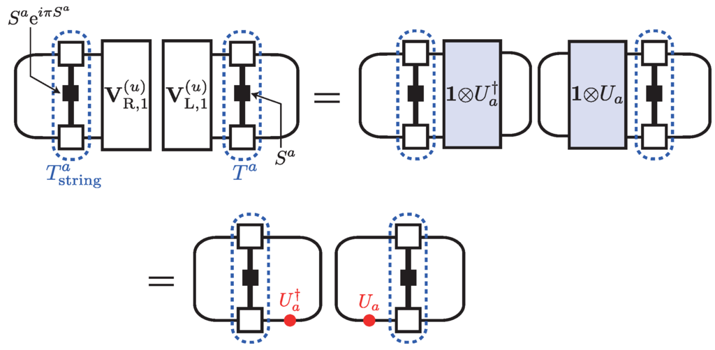 Finally, we would like to mention the recent application of MPS to the classification of the gapped topological phases in 1D. As is well-known, there is no true topological phase characterized by long-range entanglement [61,62]. However, if certain symmetries (e.g., time reversal) are imposed, topological phases characterized by short-range entanglement are possible. Since this kind of topological phase is stable only in the presence of certain protecting symmetries, they are called symmetry-protected topological (SPT) [63]. As has been mentioned above, an appropriate choice of MPS faithfully represents any given gapped (short-range entangled) ground state. Therefore, the problem of classifying all possible gapped topological phases reduces to classifying all possible MPSs by using group cohomology [61,62,64]. This program has been carried out for such elementary symmetries as time-reversal and link-parity in [65,66] (for the fermionic systems, see [67,68]) and for the Lie-group symmetries in [69,70]. Topological quantum phase transitions among these SPT phases have been discussed in, e.g., References [63,71,72].