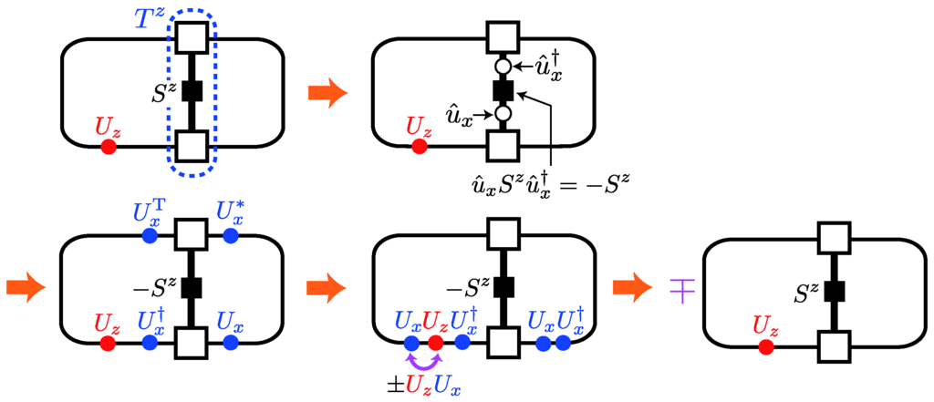 - Kennedy, T.; Tasaki, H. Hidden symmetry breaking and the Haldane phase S = 1 quantum spin chains. Commun. Math. Phys. 1992, 147, 431–484. [Google Scholar] [CrossRef]