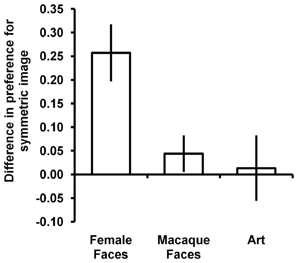 As noted, turning faces upside down appears to disrupt symmetry preferences [11]. Other studies also show that biological relevance impacts on symmetry detection and preference. Symmetry detection is easier in biological versus abstract stimuli, for example, when comparing symmetric and asymmetric photographs of animals versus dot patterns based on those same photographs [43]. In terms of preference, one recent study has shown that symmetry is preferred more in human faces than in more abstract face-like stimuli, “greebles” [42]. Further, there was no correlation between preferences for symmetry in human faces and greebles [42], suggesting domain specificity in human facial symmetry preferences. The purpose of the current study was to further examine this domain specific effect and the effect of stimulus by documenting symmetry preferences across different stimulus types: human faces, macaque monkey faces, and abstract art.