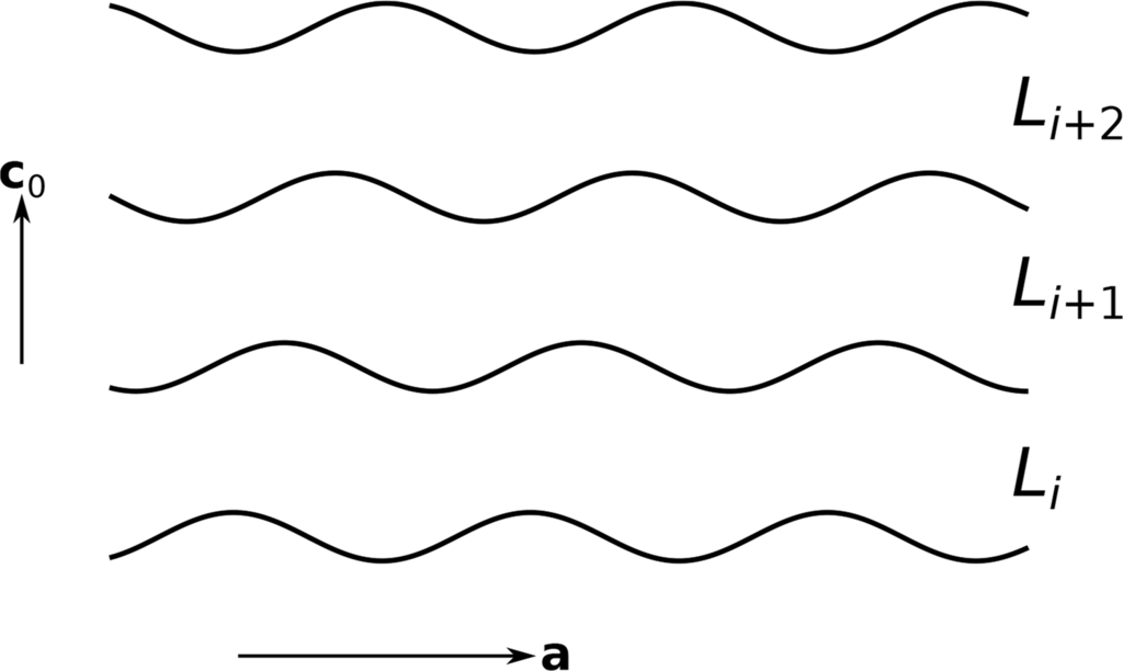 A layer is a connected, two-dimensionally periodic subspace of the three-dimensional Euclidean space E3 with continuously finite and non-zero thickness. Every point of an OD structure can be assigned to either a layer or the interface between two layers, which need not be planar (Figure 1). Thus, every layer is connected to exactly two neighbors. For simplicity, in the following text, all layers are normal to [001]. Layers are said to be equivalent or of the same kind if they are congruent or enantiomorphous [8], i.e., related by an isometry. When pairs of (not necessarily adjacent or equivalent) layers are considered, they will be called Li and Lj, and the corresponding lattice basis vectors are (ai, bi) and (aj, bj). Subscripts are omitted if only one layer is examined. The lattice parameters of the layer Li will be written as ai = |ai|, bi = |bi| and γi = ai ∧ bi. The notation a ∧ b designates (depending on the context) the measure of the angle between a and b or the angle itself (the origin being the vertex of the angle). Scalar products of vectors are indicated by a dot: a · b = |a||b| cos(a ∧ b), matrix multiplication by juxtaposition. For brevity, a · a = |a|2 is shortened to a2. The metric tensor of layer Li is: