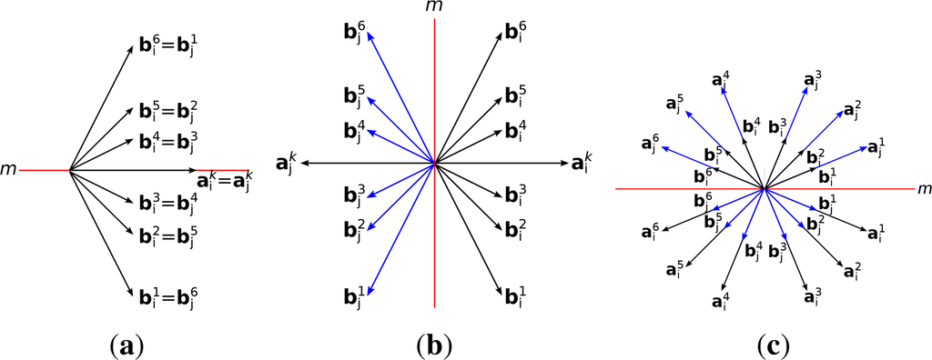 In Figure 5, the lattice basis vectors of three times six different pairs of layers ( , ), k = 1,..., 6, where the lattices of and are related by mirror operations, are represented. The mirror line is parallel to ai (Figure 5a), normal to ai (Figure 5b) or the bisector of ai ∧ bi (Figure 5c). In all three cases, there are two free parameters, and the lattice restriction can be written as in Equation (11) with V = (−1, 0, 2)T (Figure 5a,b) and V = (1, −4, 0)T (Figure 5c). Whereas the σ-POs in Figure 5a,b are different, the lattice transformations and, as a consequence, the lattice restrictions in both cases are equivalent, since mirroring at a line and at the perpendicular line are equivalent lattice transformations. In the examples of Figure 5a,b, if ai is fixed, then the end point of bi can be moved along a line normal to ai. In Figure 5c, |bi|/|ai| is fixed and the angle γi = ai ∧ bi is free. In terms of the lattice parameters a, b, γ, the lattice restrictions read as , (Figure 5a,b) and a = 2b (Figure 5c).