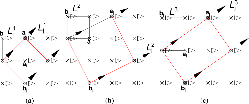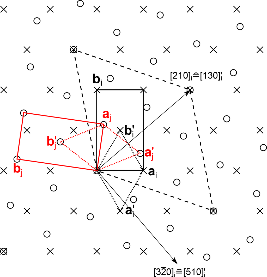 In Figure 9, the lattices of two equivalent layers Li and Lj with c22(2) symmetry are represented by crosses and circles, respectively. The bases of the centered setting of the layers are (ai, bi) and (aj, bj) and the lattice parameters a, b and γ. The transformation matrix with respect to (ai, bi) reads as: