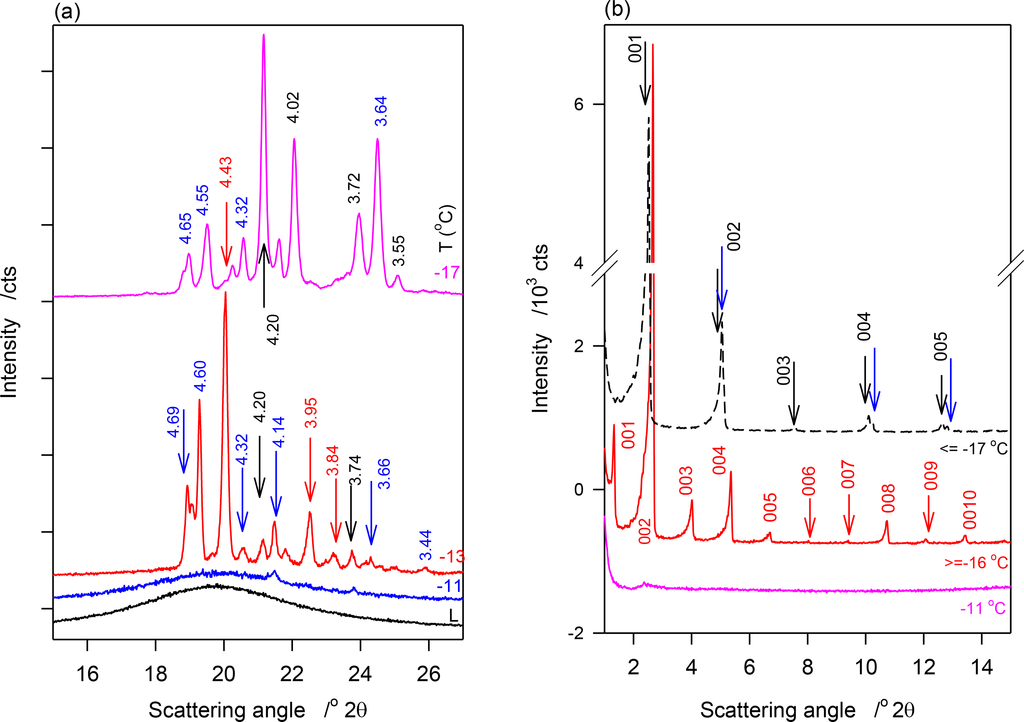 Similar to the stepped experiments, three small and broad peaks, at 4.20, 4.14 and 3.74 Å of the β′-phase appeared at −11 °C in the WAXD pattern of JLE-281 during the continuous experiments (Figure 3a). These peaks remained weak and broad, superimposed to a wide and large halo, until −17 °C where a large number of reflections from the β- and β′-phases appeared alongside the first three peaks. The intensity of the peaks of both phases increased as the sample was cooled further (Figure 3a, Table 3).