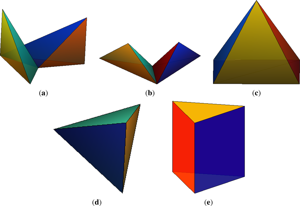 The symmetry group Dn has 2n elements: n rotations by the z-axis (identical with Cn) and n rotations by π around axes perpendicular to z. We have again a double pyramid as in Cnh, but the bottom pyramid is a rotation by π of the top pyramid. An example from connected tetrahedrons is in Figure 1e.We can combine the dihedral symmetry with the reflection: