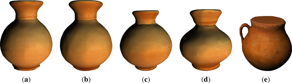 This experiment is an example of behavior of the invariants on real objects. We chose five real objects—archeological findings from ancient Greece, as an example. The objects were scanned by a laser rangefinder from several sides and the measurements were combined together to obtain a 3D binary image of the object (see Figure 5). Since the rangefinder cannot penetrate inside the objects, the vases are considered full and closed on the top. As a result of the acquisition, we obtain a triangulated surface of the object. In this experiment we worked solely with binary shapes and ignored color and texture, they are shown for illustration only. We used 37 invariants Φ1–Φ37 in this experiment.