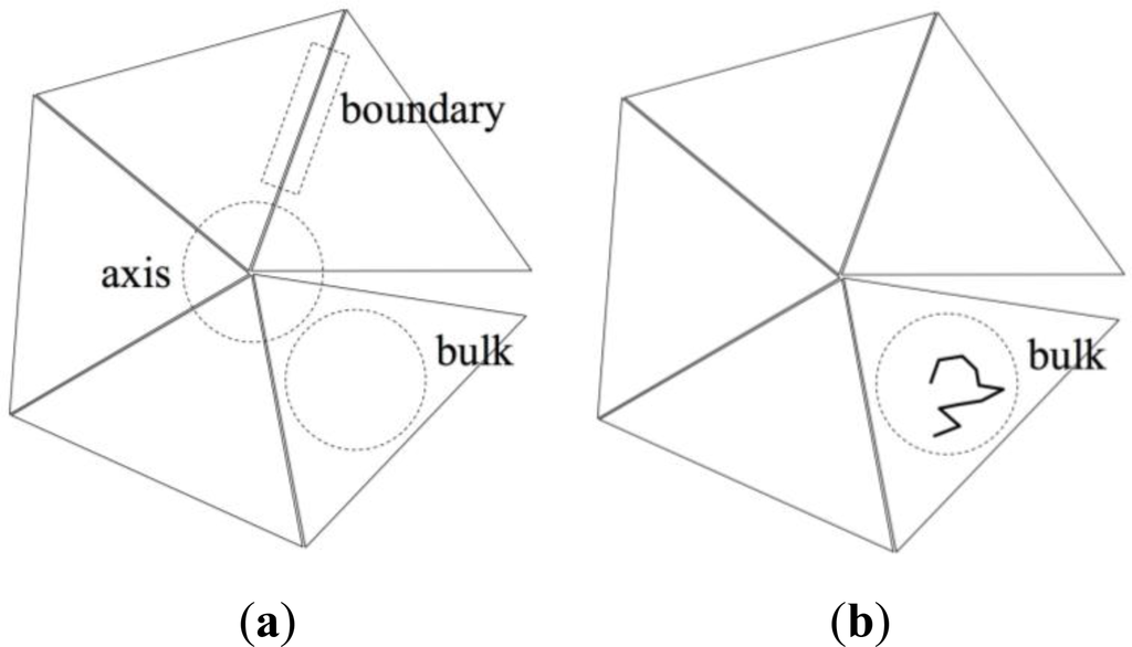 Figure 8 is a qualitative depiction of this phenomenon: the portions of boundary and axis chains, marked by arrows, contained in these regions (drawn as a dashed line rectangle and circle respectively) are conformationally quite different from the rest of the chain, which lies outside these anomalous regions. The entropic loss for the chains located in the boundary and in the axis stems primarily from the anomalous conformations that part of the chain must adopt in order to fit in the boundary or axis regions. In particular, the portions of the chains residing in the twin axis are forced to adopt very “unnatural” conformations due to the nearly perfect pentagonal symmetry about the twin axis. These are conformations of very low probability for bulk chains. The number of possible chain conformations that are compatible with the pentacyclic symmetry of the axis region is considerably lower than for chains in the bulk. A similar situation applies to chains in the boundary, although the reduction in the number of conformations is much less drastic than in the axis region.