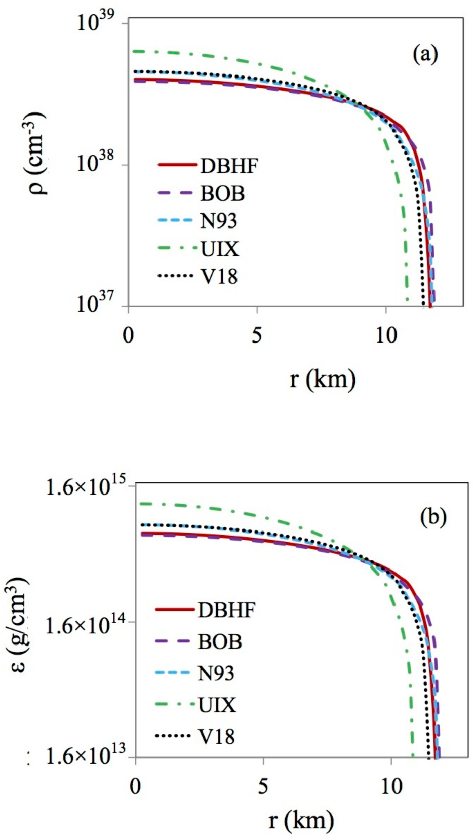 We close this section by showing in Figure 1 the baryon density and the mass-energy density profile of a neutron star with a mass of 1.4 solar masses (the most probable mass). Our DBHF predictions are compared with those of other microscopic models, which are taken from [50]. There (and in previous work by the same authors), the Brueckner–Hartree–Fock formalism is employed along with microscopic meson-exchange three-body forces. In particular, in [51], the meson-exchange three-body forces are constructed applying the same parameters as those used in the corresponding nucleon-nucleon potentials, which are: Argonne V18 [52] (V18), Bonn B [3] (BOB) and Nijmegen 93 [53] (N93). The popular (but phenomenological) Urbana three-body force [54] (UIX) is also utilized in [51]. At subnuclear densities, all of the EoS considered in the figure are joined with the crustal equations of state from Harrison and Wheeler [55] and Negele and Vautherin [56]. The composition of the crust is crystalline, with light [55] or heavy [56] metals and electron gas.