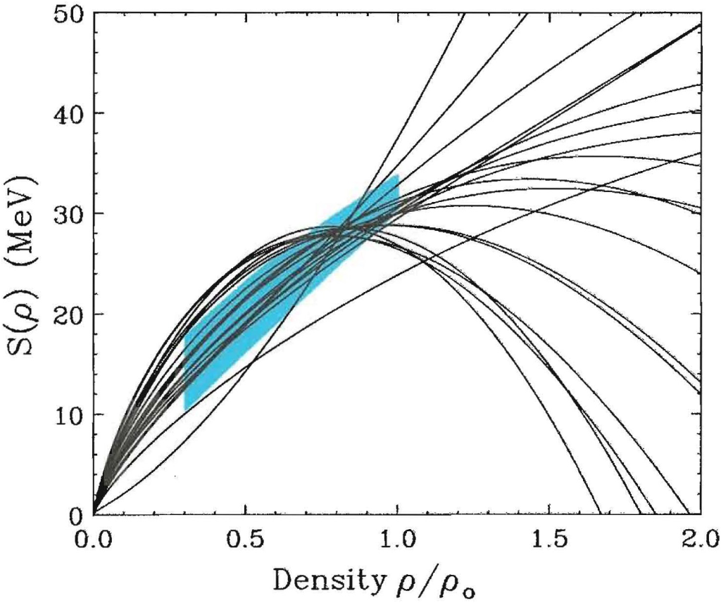 Equation (6) displays a convenient separation between the symmetric and the asymmetric parts of the EoS, which facilitates the identification of observables that may be sensitive, for instance, mainly to the symmetry energy. Empirical investigations appear to agree reasonably well on parameterizations of the symmetry energy having the form: