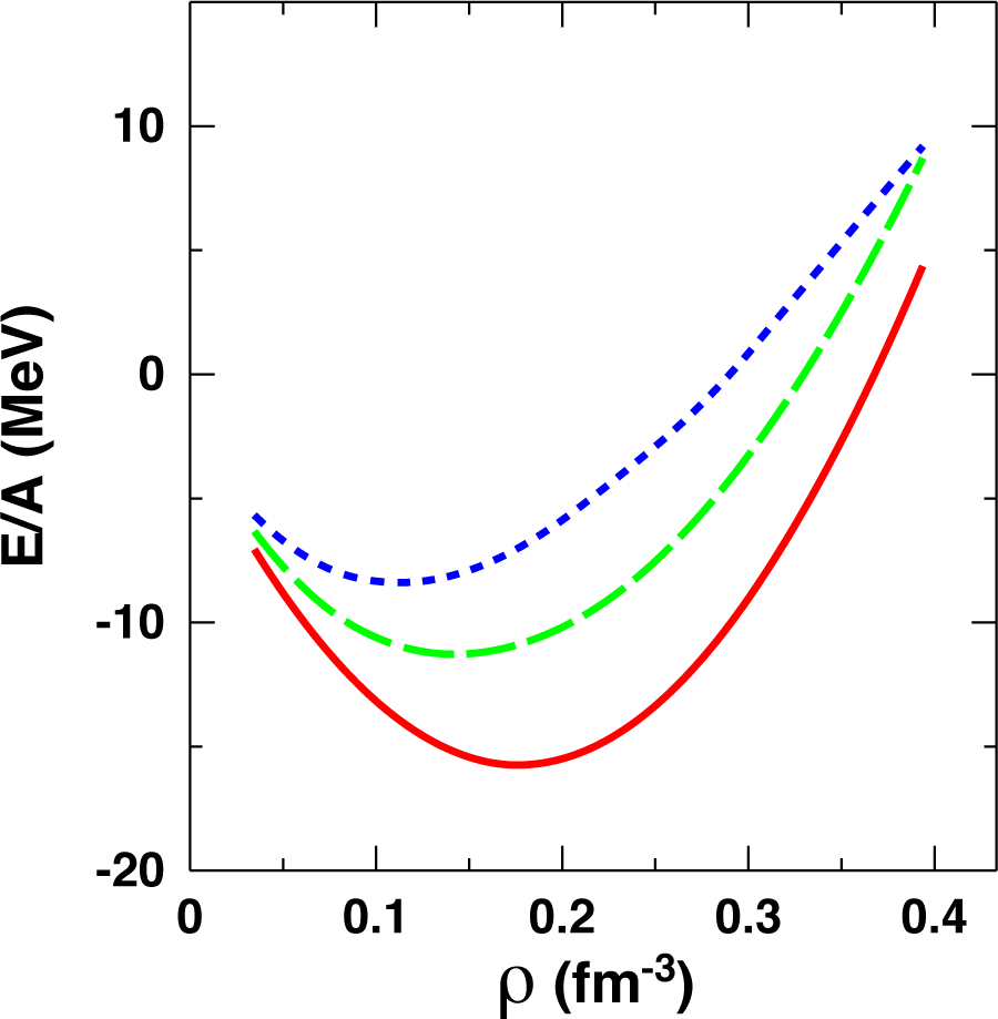 For the case of (cold) isospin-asymmetric nuclear matter, where proton and neutron densities are different, the energy per particle is a function of both the total density and the relative concentrations of protons and neutrons. Naturally, the latter dependence is related to the symmetry term in the Bethe–Weizäcker formula, Equation (1). These aspects will be discussed in more detail in Section 2.