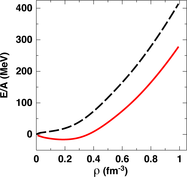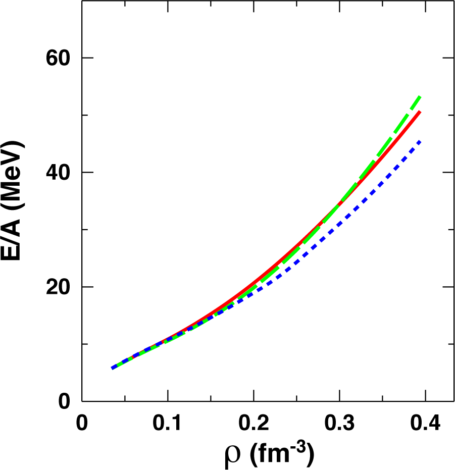The EoS, or energy per nucleon as a function of density, is then written as: