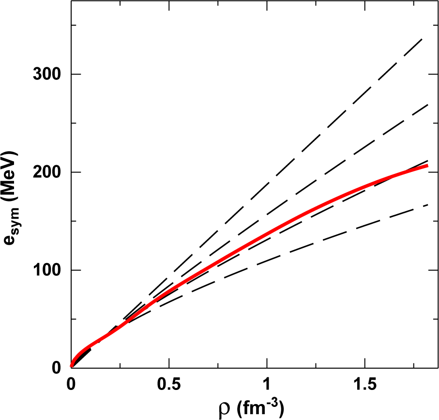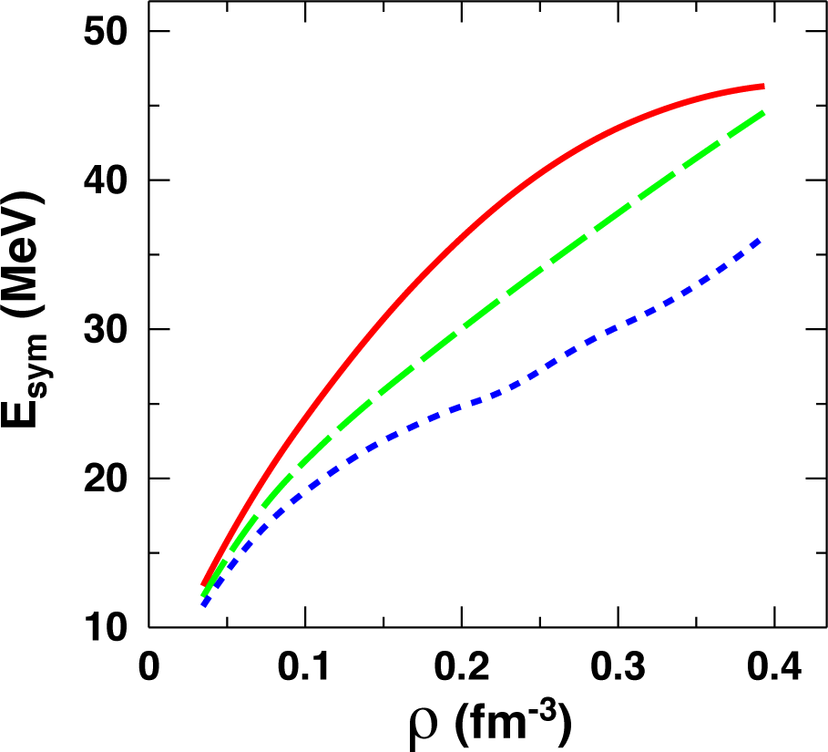 . A typical value for esym at nuclear matter saturation density (ρ0) is 30 MeV, with theoretical predictions spreading approximately between 26 and 35 MeV.