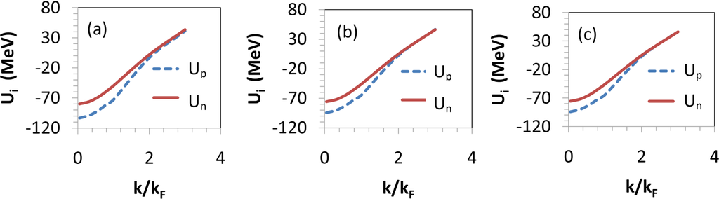 where each of the four pieces on the right-hand-side of Equations (23) and (24) signifies an integral of the appropriate G-matrix elements (nn, pp or np) obtained from Equation (22). Clearly, the two equations above are coupled through the np component, and so, they must be solved simultaneously. Furthermore, the G-matrix equation and Equations (23) and (24) are coupled through the single-particle energy (which includes the single-particle potential, itself defined in terms of the G-matrix). Therefore, we have a coupled system to be solved self-consistently. That is accomplished through a suitable ansatz and parameterization of the single-nucleon potential [60]. When this procedure has converged, the single-nucleon potentials are available. Finally, the energy per neutron or proton in nuclear matter is calculated from the average values of the kinetic and potential energies as: