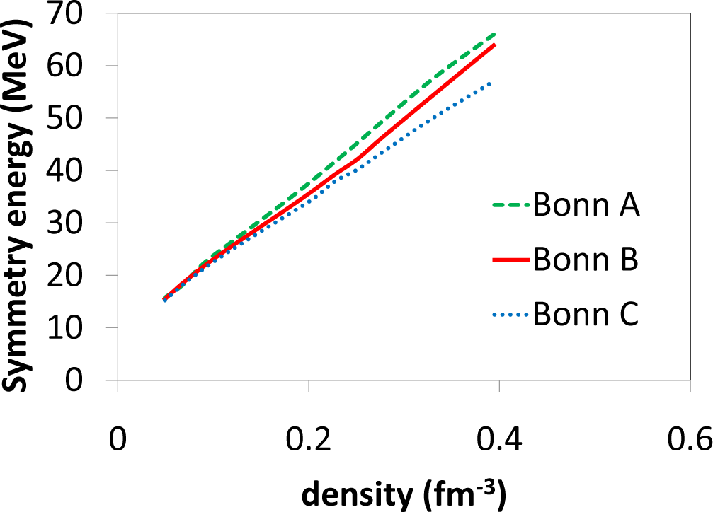 Cutoff dependence appears strongly reduced in pure neutron matter; see Figure 13. At the two-body level, this points to the tensor force as the most likely source of the cutoff dependence seen in nuclear matter, recalling the chief contribution from the tensor force to the latter, mostly through partial waves with isospin zero. Naturally, cutoff dependence carries on to the symmetry energy, as shown in Figure 14.
