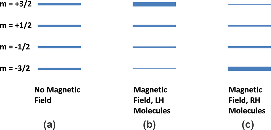 in a zero magnetic field (a), and for left-handed molecules (b) and right-handed molecules (c) in the presence of an external magnetic field. The thickness of the line indicates the magnitude of the population of each sub-state [,]. Courtesy of the International Journal of Molecular Sciences and Springer Publishing.