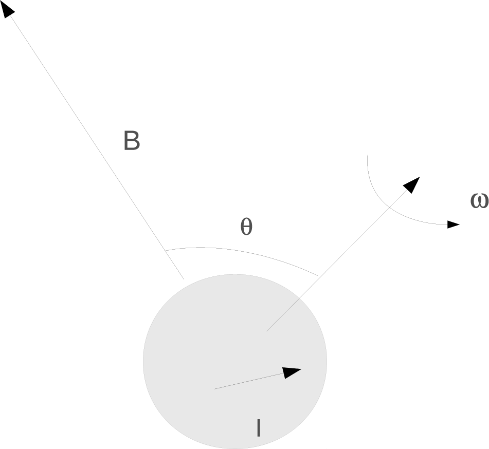 For a material of non-zero magnetic moment in an external magnetic field B○, the angular momentum vector will precess about the magnetic field axis with the precession frequency ω○ = γB○. The rotation of the meteoroid in the magnetic field induces an NMR-like situation in which a rotating magnetic field B1 exists about a stationary magnetic field B○ in the reference frame of the meteoroid. In the case of an additional field B1 perpendicular to the external field and rotating about B○ with a frequency ω, the precession frequency about this field vector is defined as ω1 = γB1. Equation (4) can then be solved by assuming a rotating reference frame in which B1 is stationary.