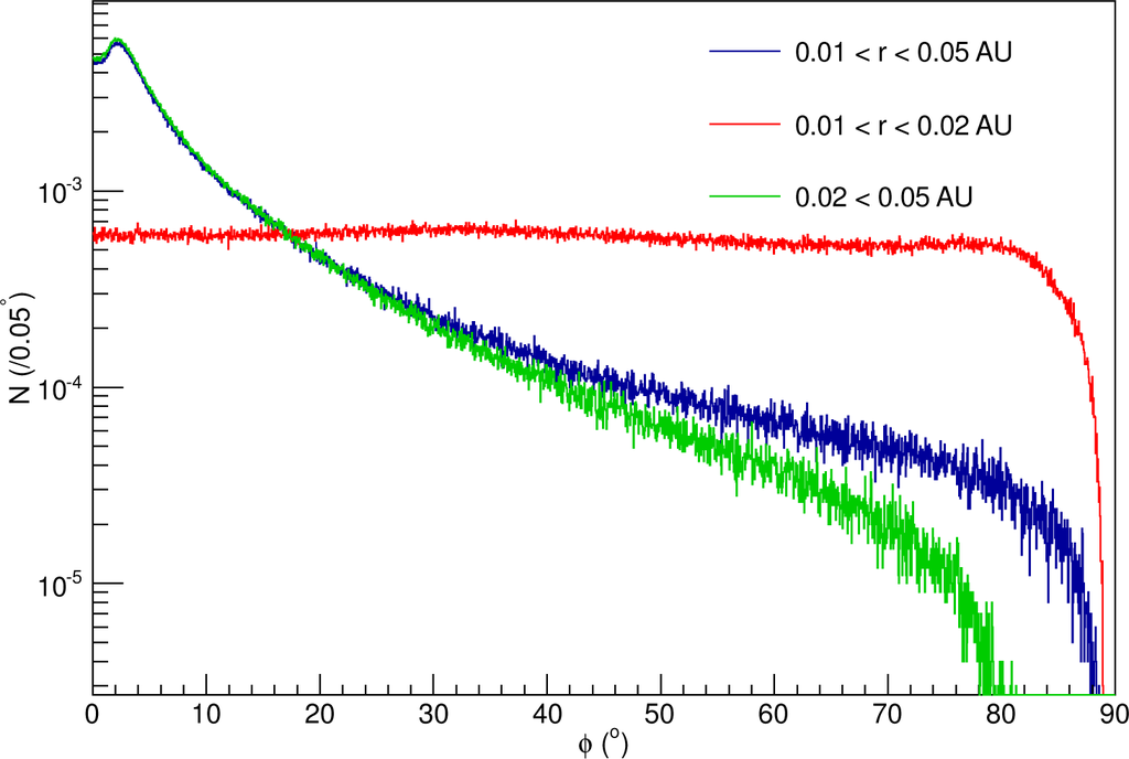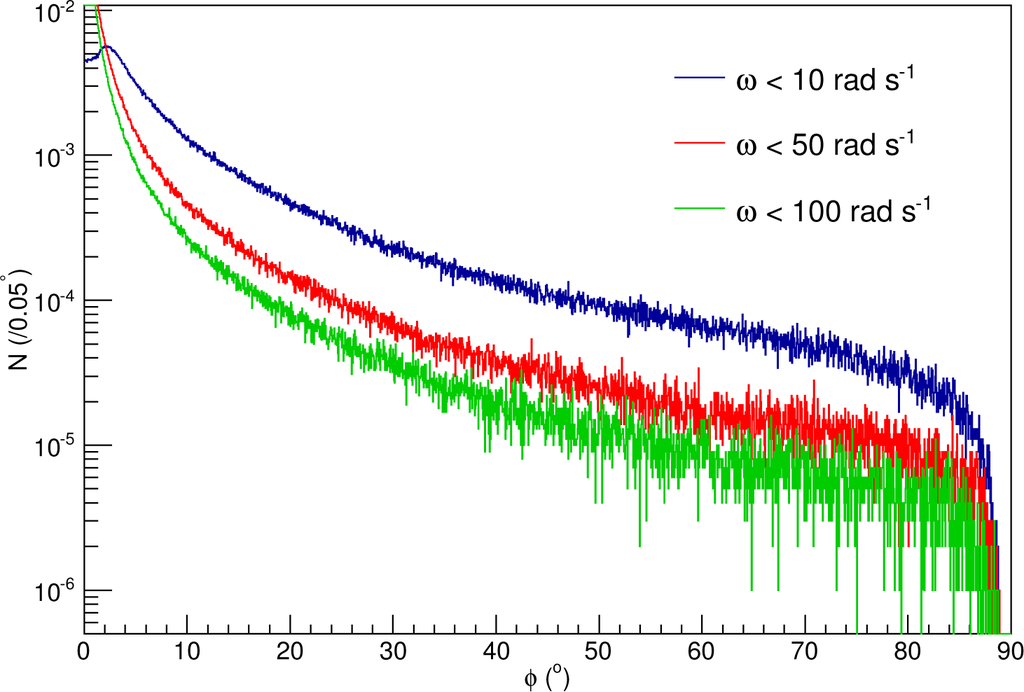 Figure 4 shows the results of Models A, B and C, in which the meteoroids are uniformly distributed in increasingly incremented radial regions as indicated in Table 1. The angular speed of the meteoroid in each event varies uniformly between 0 and 10 rad s−1. The distribution of polarization with respect to the stellar magnetic field vector is shown for these models in the figure. The bulk polarization is seen to increase dramatically with radius. For the random orientation of the meteoroid rotational velocity vectors, the value of the precession frequency ω1 about the perpendicular component of the magnetic field in the meteoroid’s reference frame decreases as well, resulting in a smaller perpendicular component of magnetization and a larger parallel component (Equation (6)).